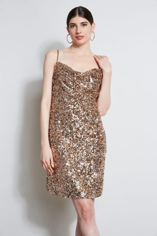 - Sleeveless Sequin Dress with Draped Cowl Neckline