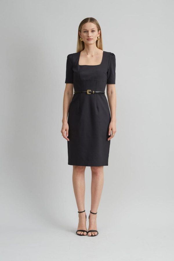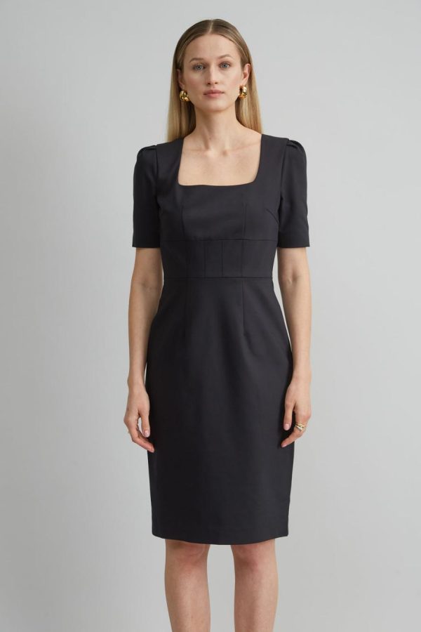 Cut from a cotton-blend, our bodycon dress has an elegant square neckline & short sleeves with subtle pleats at the shoulder. Its chic minimalistic design & body skimming silhouette make this dress decidedly cool.