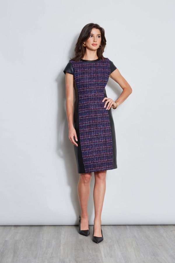 Go all in on city chic with our Vegan Leather Panel Italian Tweed Dress. The modern design features vegan leather short sleeves and side panel detailing that gives the dress its flattering body skimming silhouette. You will love the look & feel of this standout dress.