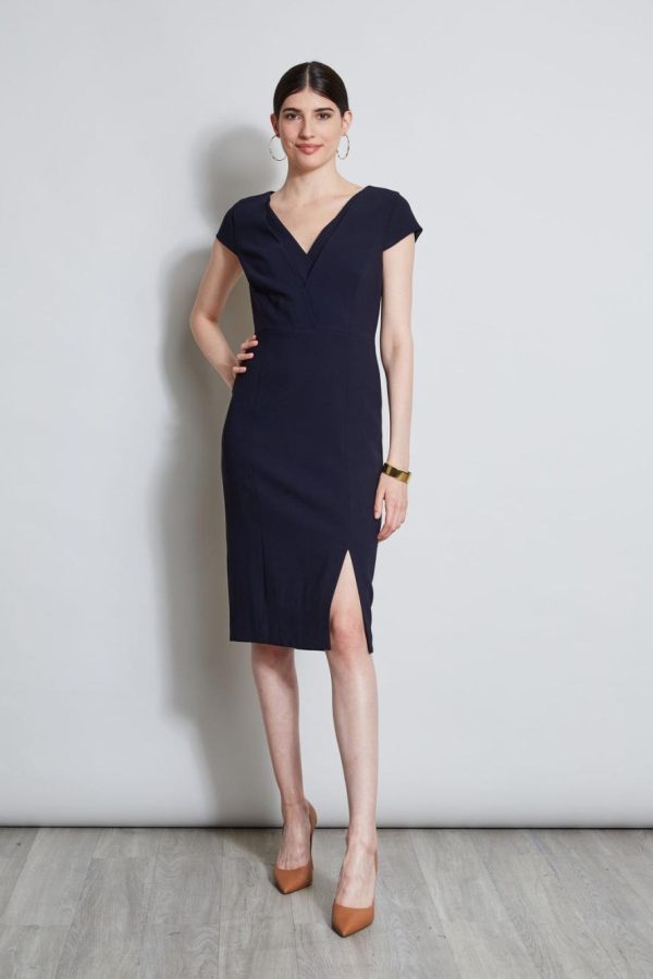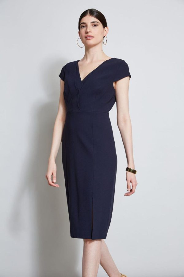 Elie’s take on the season’s must have sheath dress. The body contouring lines accent its modern slit & double layer v-neckline. Designed in our signature Fluid Crepe, it flatters every curve. This dress is destined to become a favorite for desk to dinner.