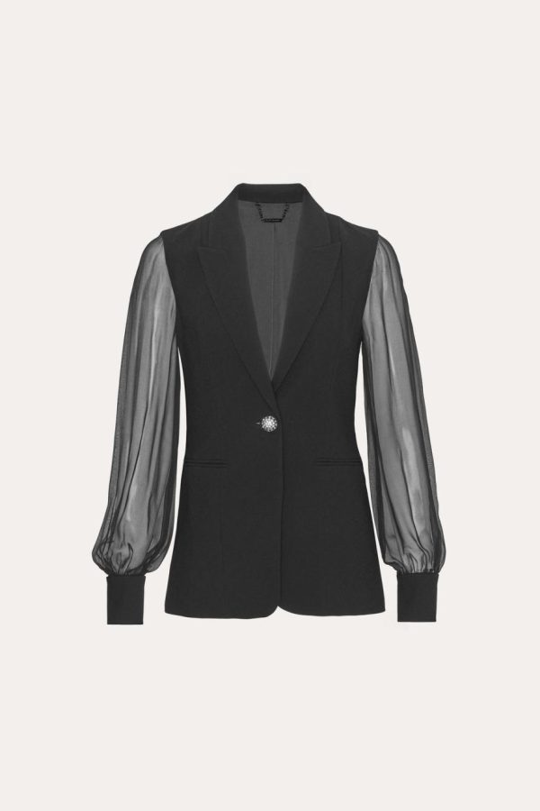 - Single Breasted Blazer with Silk Chiffon Sleeves & Jewel Button Closure