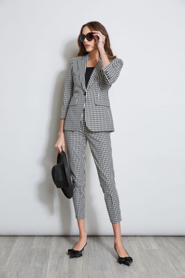 Trend Alert! Meet the season ‘s must have Gingham Jacket. We love the modern retro vibe of this sophisticated stretch Gingham in our 3/4 Sleeve Single Button Jacket. Pair it with its matching gingham pant, dress pants or mix it up with denim for an easy cool vibe.