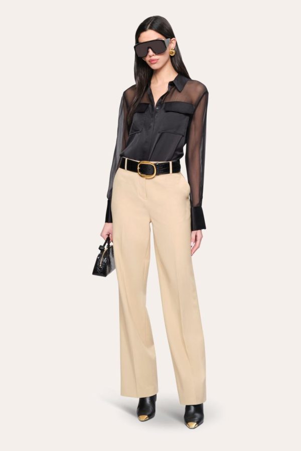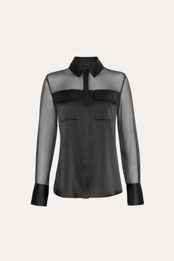 Made from silk satin, this button-down reimagines utility with tailored pockets and a classic collar. Transparent chiffon panels at the shoulders and sleeves add a delicate touch of lightness and sophistication.