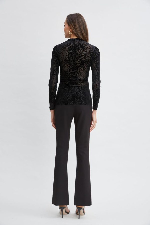 A knit with the cool factor – our modern Mock Wrap Knit has flattering side ruch detailing that gives it artistic expression, while the luxe patina & texture of the burn out velvet jersey make it unique.