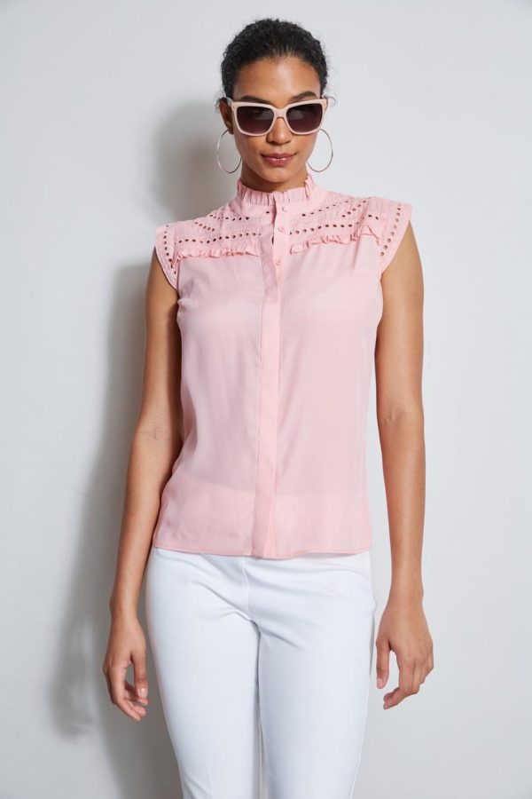 - Silk Blend Sleeveless Button Down Shirt with openwork Embroidery details & Ruffles