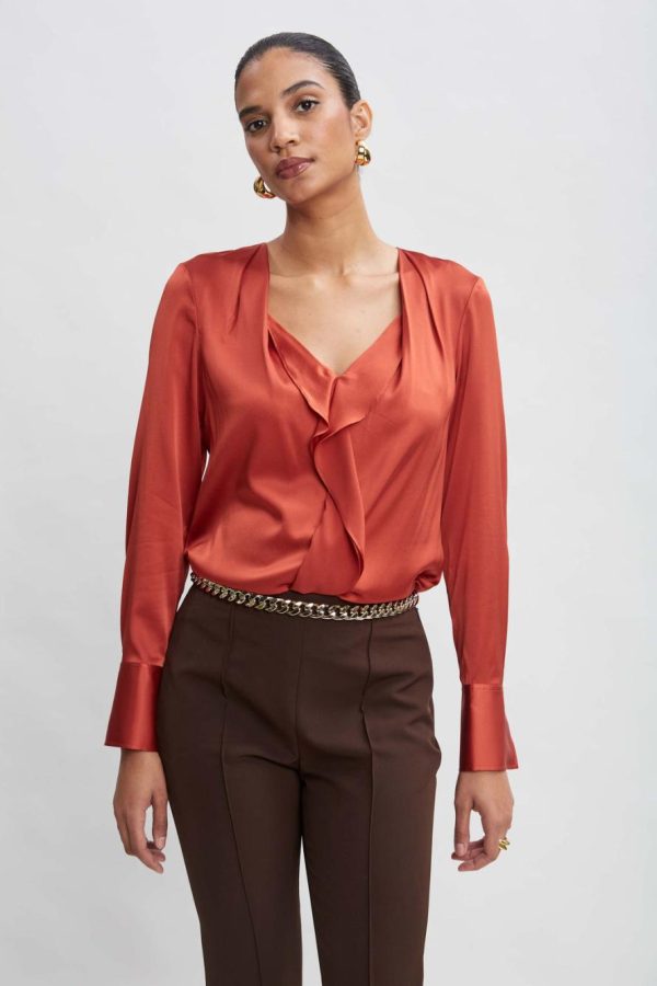 It’s all in the details! All eyes are on the modern contour neckline & cascading ruffle of our Stretch Silk Satin Shirt. Dress it up with heels & our Overlay Pant or down with our denim for a fresh take on a must-have.